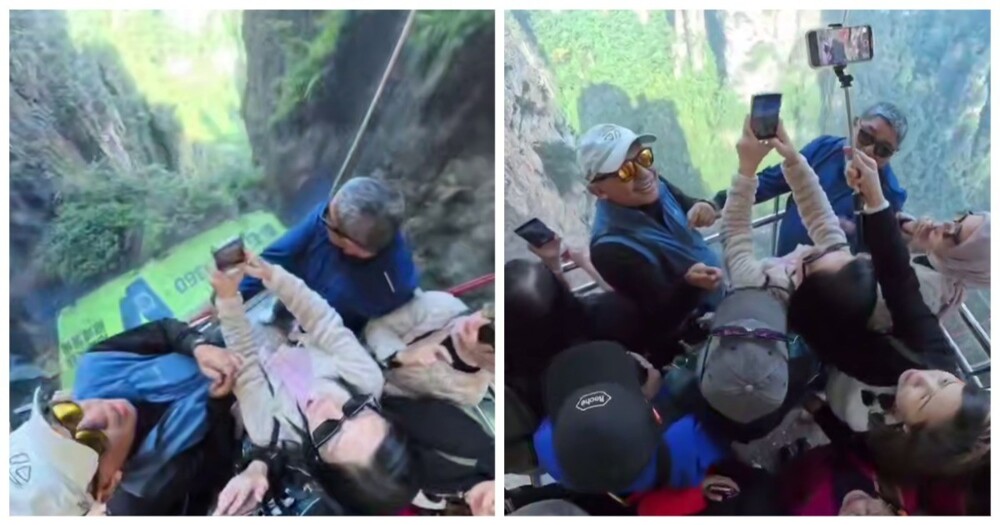 Группа туристов поднимается на вершину 326-метровой скалы в национальном парке Чжанцзяцзе на самом высоком в мире уличном лифте. Он носит название "Лифт ста драконов".