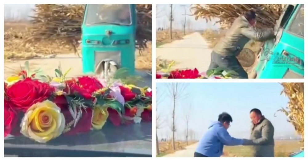 Свадебный кортеж, двигавшийся по узкой просёлочной дороге в провинции Шаньдун, встретил мужчину на трехколесном транспортном средстве. Водитель решил уступить дорогу молодым. Он уложил свою рабочую машину на бок, освободив проезд.