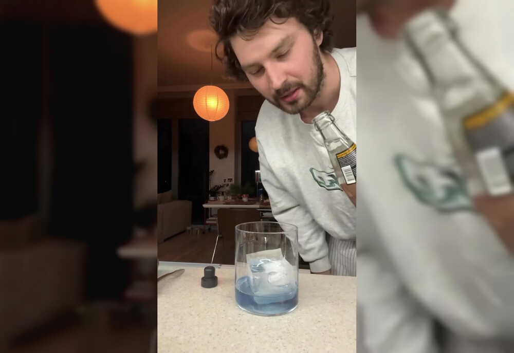 Парень показал голубой джин, который делает его отец, настаивая спирт на японском цветке кальтории. Напиток имеет естественный голубой оттенок, а при добавлении тоника из-за окислительной реакции превращается в розовый.