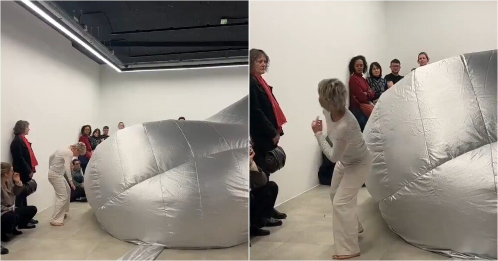 Женщина перемещается вокруг инсталляции, произносит неразборчивые фразы и совершает ритуальные на первый взгляд движения. Авторы называют это перформансом, смысл которого каждый зритель волен понять по-своему.