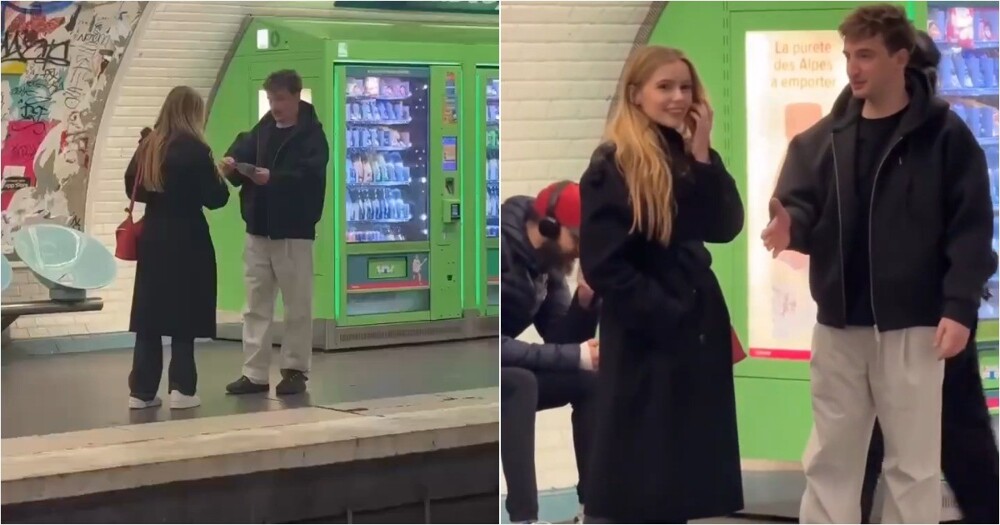 Парень показал девушке карточный фокус прямо в метро. К трюку оказались незаметно подключены его друзья, из-за чего результат выглядел совершенно необъяснимым.