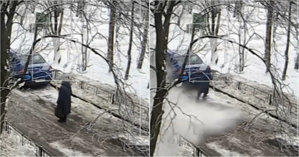 Идущая вдоль дома №9/2 на проспекте Художников дама чудом осталась жива, так как успела отскочить за секунду до того, как снежный ком обрушился в миллиметре от нее.