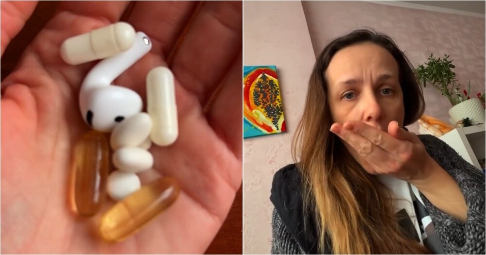 Девушка заранее закинула в карман таблетки, чтобы выпить их за обедом. В нужный момент, не глядя, закинула всё в рот и запила водой.