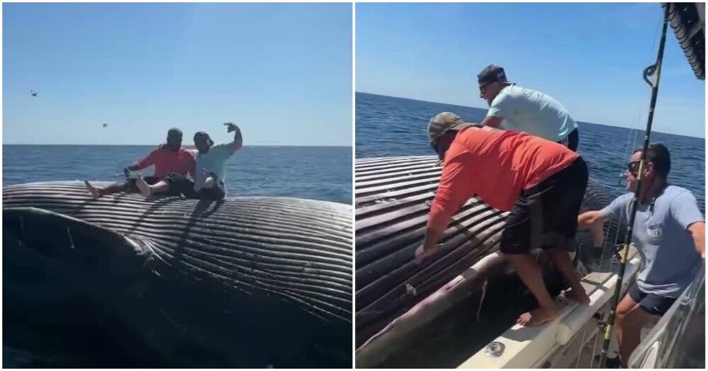 Два нетрезвых рыбака запрыгнули на дрейфующую в море тушу кита. Приятель мужчин запечатлел их на видео.