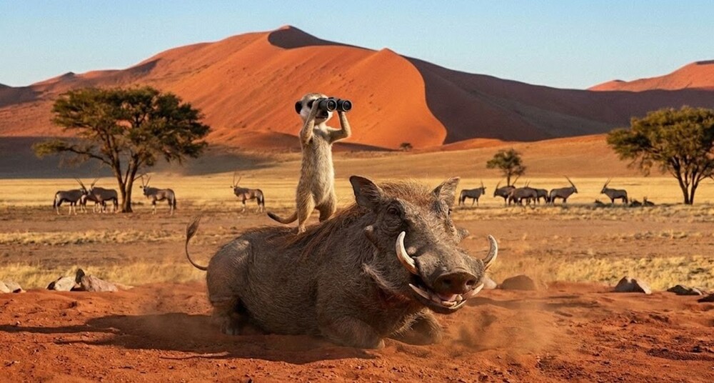В заповеднике Намибии живут дружелюбные сурикаты и бородавочники. Они проводят время вместе, прямо как в «Короле льве».
