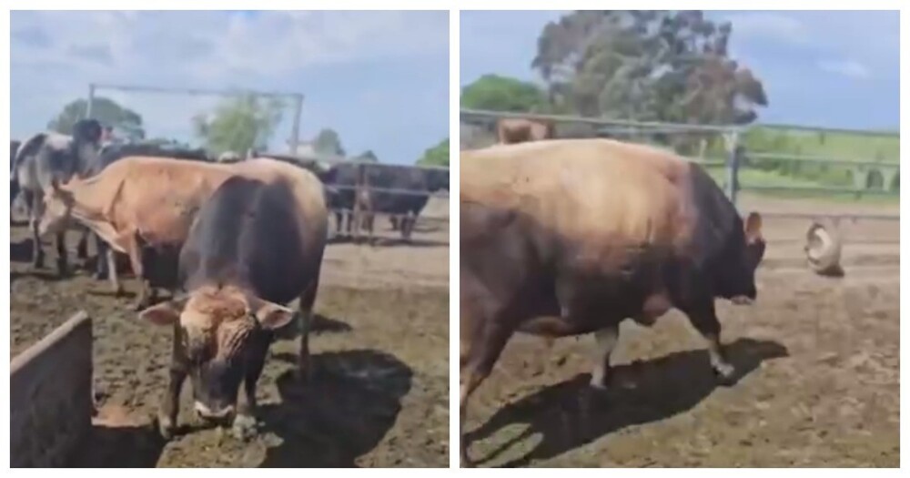 Мужчина показал, как отогнать быка, который собирается напасть. Автор ролика предлагает издать звуки, которые должны сбить животное с толку и заставить отступить.