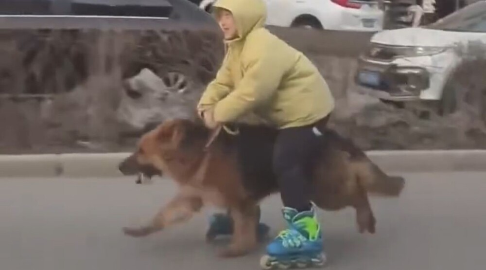 В Китае мальчик придумал необычный способ передвижения по улицам города. Он сочетает прогулку с собакой с личной "транспортировкой".