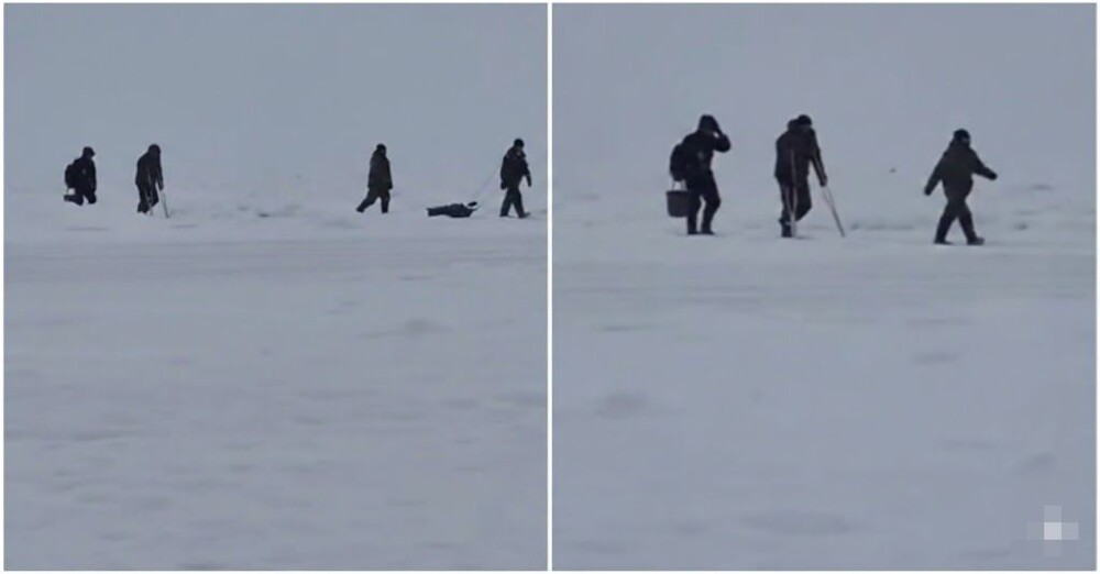 На Сахалине засняли рыбака, передвигающегося на костылях. Мужчина шёл вместе с приятелями к месту ловли рыбы в районе Стародубского.