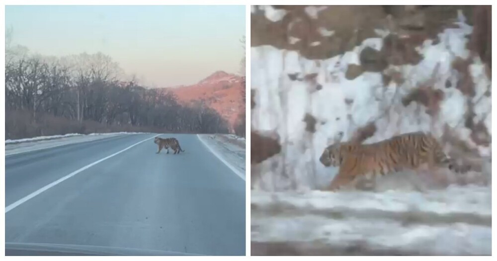Автолюбитель опубликовал в сети кадры встречи с двумя тиграми по пути из Зарубино в Славянку. Один полосатый хищник перебежал дорогу перед машиной, а второй обогнал транспортное средство по обочине и забрался на гору.