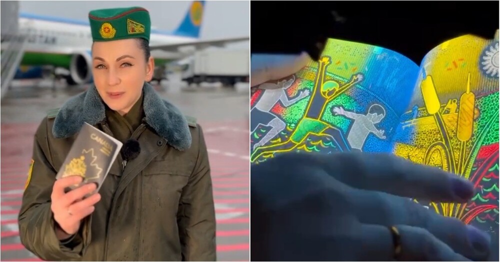 При проверке канадского паспорта пограничники продемонстрировали, как под специальной ультрафиолетовой лампой проявляются скрытые элементы: кленовые листья, орнаменты и контуры. Эти детали защищают документ от подделок, а рисунки могут различаться в зависимости от серии и года выпуска паспорта.