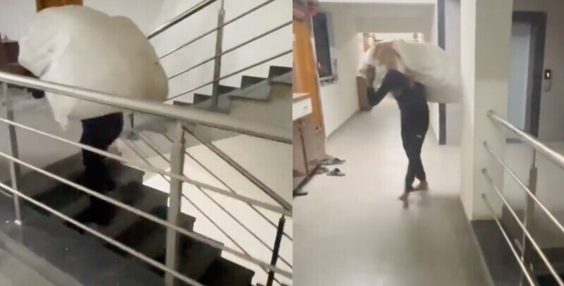 Видео, на котором курьер с трудом поднимается по нескольким лестничным пролетам с огромной посылкой на спине, вызвало ожесточенные дебаты по поводу уважения к труду и правил жилищных кооперативов.