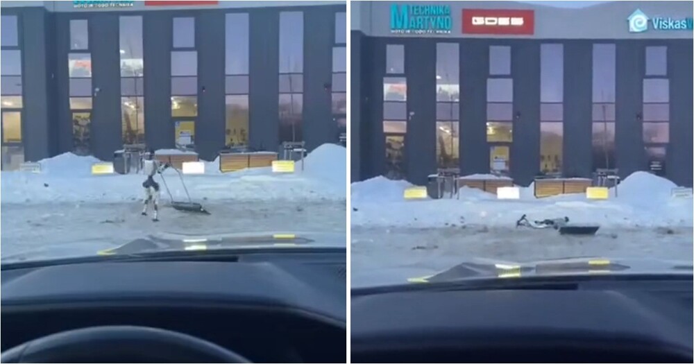 Планируемое «восстание роботов» придётся отложить: один из металлических помощников пытался убрать снег лопатой… и, увы, не удержался на ногах и упал прямо в снег.