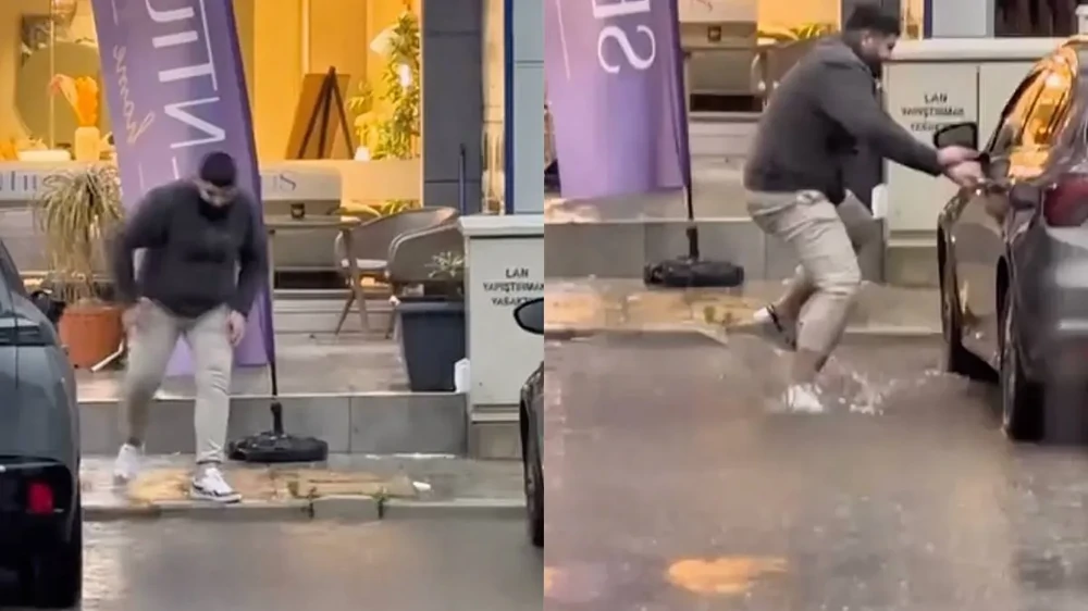 В последние дни западная Турция страдает от сильных дождей. На одной из затопленных парковок мужчина попытался запрыгнуть в автомобиль, но не смог удержаться, продемонстрировав неожиданно комичную сцену.