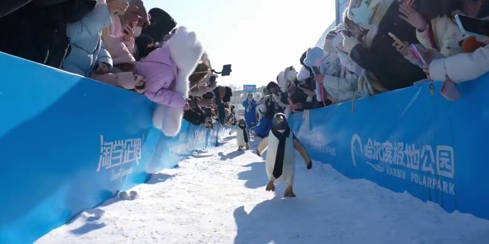 В Харбине в рамках фестиваля Harbin Polarland состоялся ежегодный парад пингвинов. Птицы прошли по специальному маршруту в сопровождении сотрудников парка.