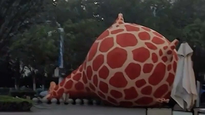 В Китае необычная пробка произошла из‑за надувного жирафа: сильный ветер сдул конструкцию прямо в тоннель, перегородив движение.