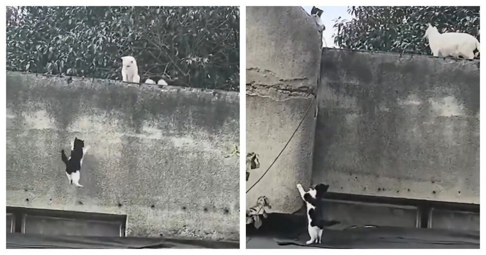 Девушка запечатлела небольшую кошачью семейную драму. Котёнок пытался преодолеть препятствие и забраться к кошке, но раз за разом терпел неудачу.