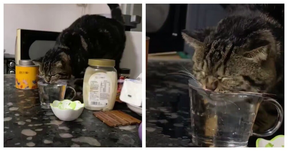 Домашнему коту не объяснили, как правильно пить воду из чашки, и теперь он делает это по-своему.