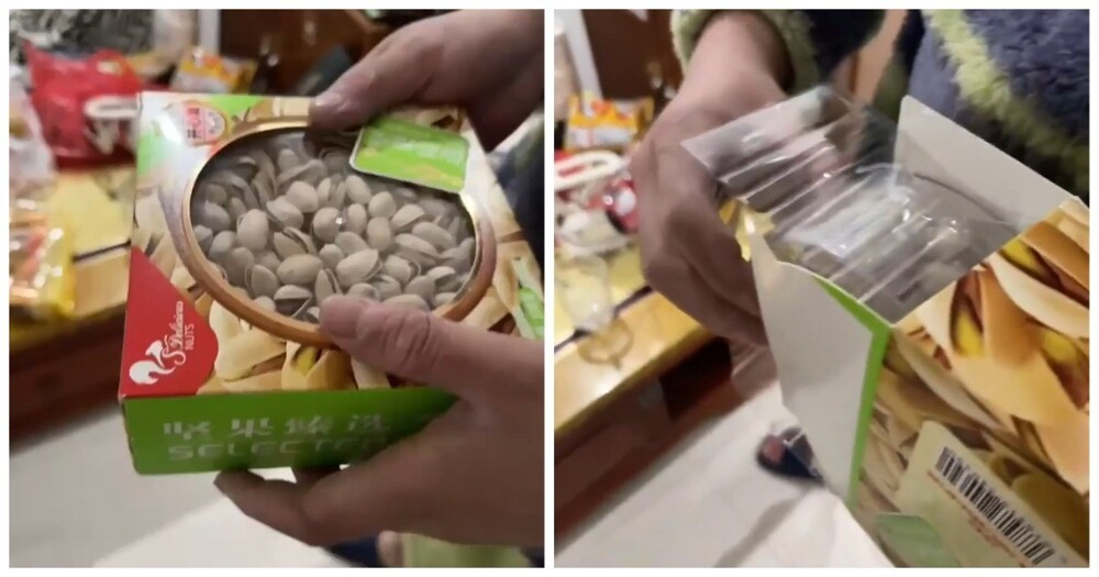 Мужчина демонстрирует реальное количество фисташек в коробке. Вот почему стоит обращать внимание на вес товара при прокупке.