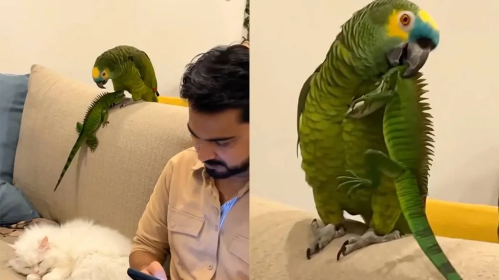 Домашний попугай по кличке «Джокер» внезапно поднял громкий шум, напугав других питомцев — игуану и кота. После короткой суматохи пернатый, словно вишенка на торте, разразился характерным «зловещим» смехом, чем окончательно закрепил за собой репутацию главного хулигана в доме.