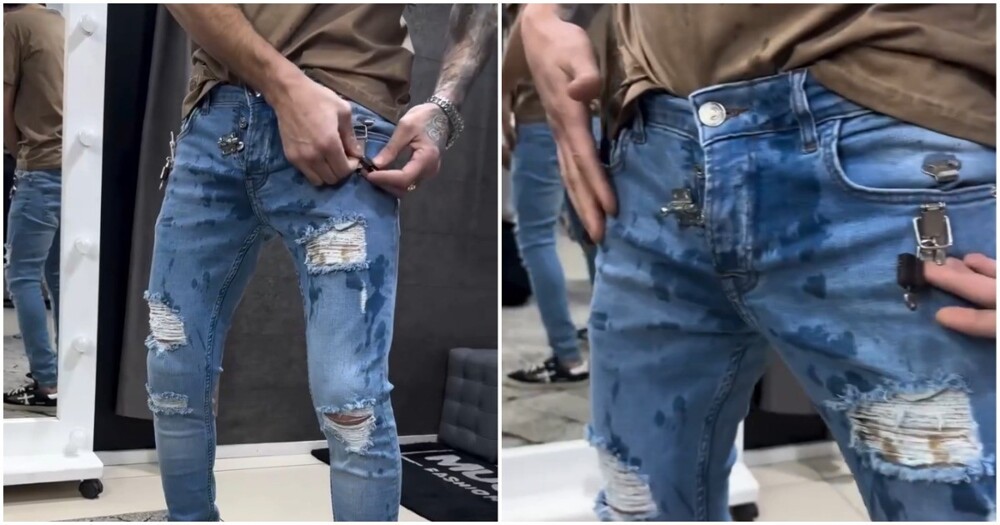 Мужчина показал джинсы с мокрым эффектом и щеколдой в области ширинки.