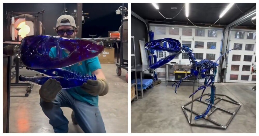 Американский стеклодув показал скелет дакотараптора, на который у него ушло 10 месяцев. Каждую кость динозавра он выдувал "вручную".