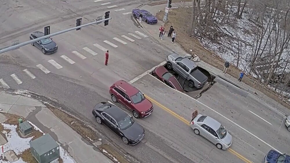 В одном из городов США два автомобиля внезапно провалились в образовавшуюся на дороге яму, когда стояли на светофоре. Один из водителей смог самостоятельно выбраться из машины, после чего помог выбраться водителю второго автомобиля. Обстоятельства происшествия и причины образования провала уточняются.