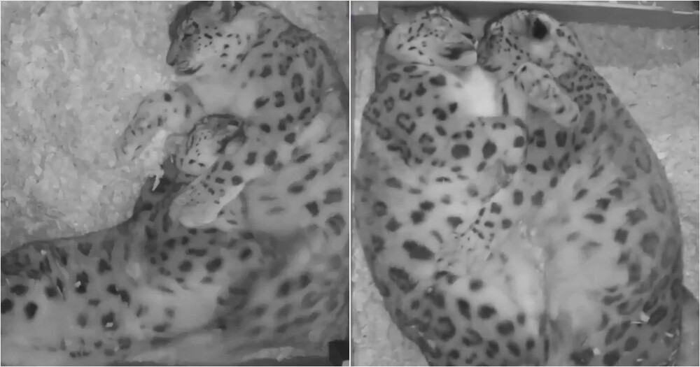 Типичная сцена из жизни семьи снежных барсов: один развалился по диагонали, закинув лапы на партнера, другой просто лежит рядом. Даже грозные и редкие хищники порой ведут себя так же, как люди — уютно, лениво и беззаботно.