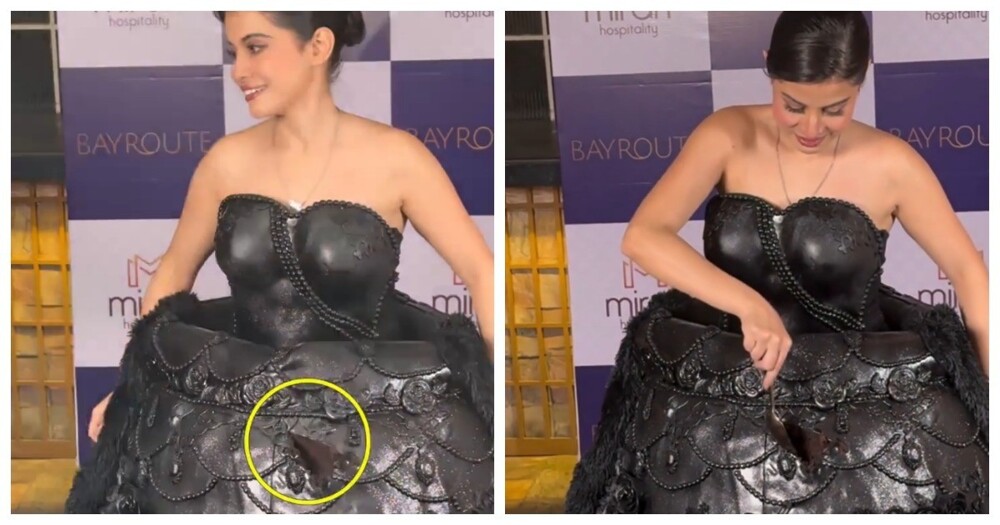 Индийская актриса появилась на одном из светских мероприятий в торте в виде платья. Девушка отрезала куски наряда и раздавала их всем желающим.