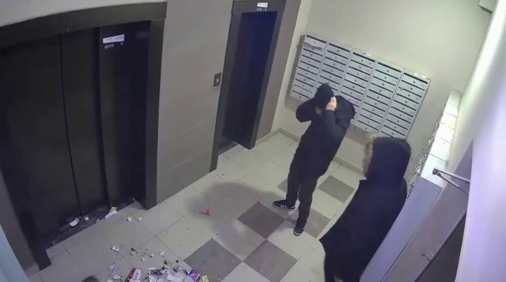 Камера наблюдения, установленная в подъезде жилого дома в Тюмени, запечатлела двух мужчин навеселе. Один из незнакомцев решил по-своему отличиться.