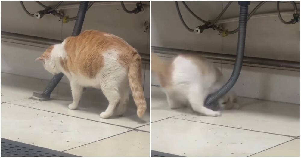 Кошка (или кот) ловко поймала крысу. Тот самый момент, когда не соврал в резюме при устройстве на работу.