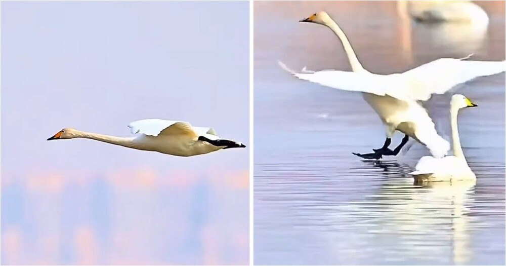 На кадрах видно, как лебеди заходят на посадку с поразительной точностью и грацией. Их техника приземления на воду выглядит одновременно мощной и плавной — редкое сочетание силы и контроля, которое впечатляет даже при коротком наблюдении.