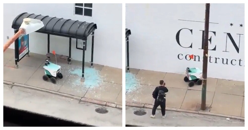 В Чикаго робот-курьер врезался в стекляную стенку автобусной остановки. После этого робот начал двигаться так, будто пытается стряхнуть с себя стекло.