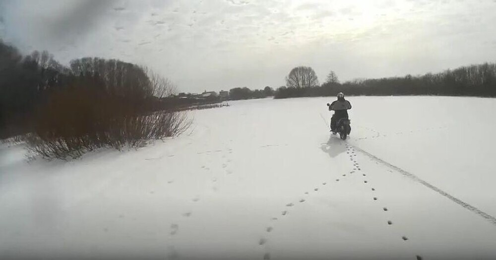 В Беларуси мотоциклисты рискнули выехать на замерзшее озеро на своих мотоциклах. Но лед оказался тоньше, чем ожидалось, — это имело серьезные последствия для одного из байкеров.