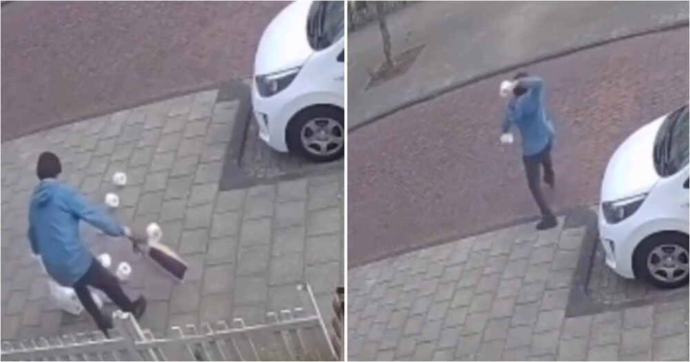 На одной из городских улиц молодой человек уронил несколько рулонов бумаги и не смог скрыть эмоций, собирая их обратно в сумку.