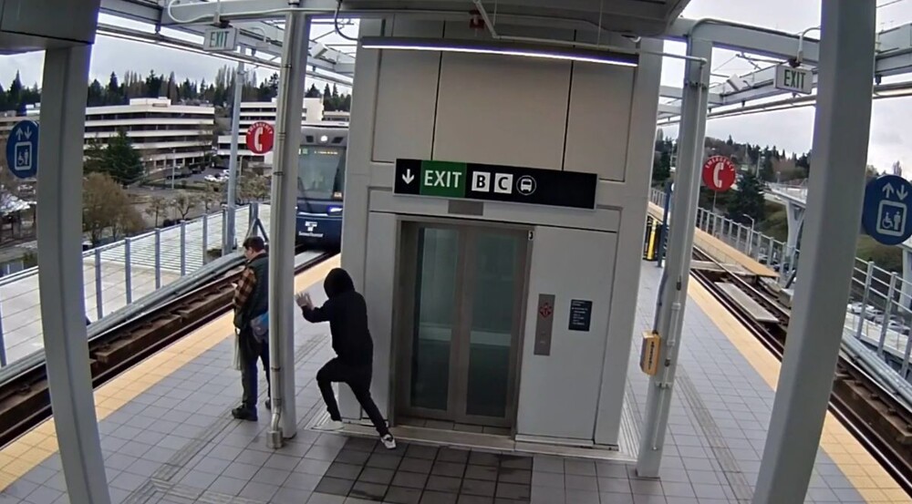 Камера наблюдения, установленная на железнодорожной платформе в США, запечатлела момент покушения на убийство. 26-летний мужчина попытался сбросить незнакомца под поезд.