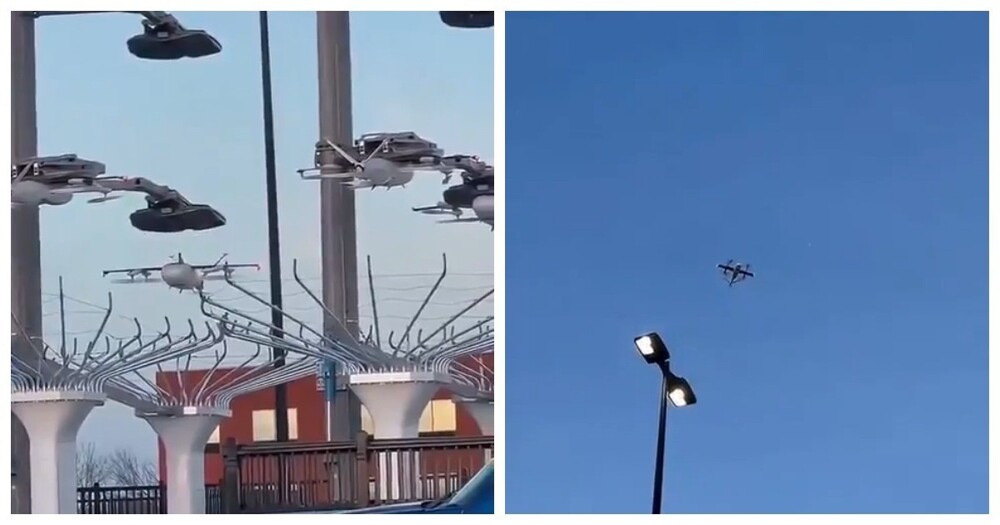 Так выглядит система доставки дронами у Walmart, которая сейчас работает в тестовом режиме. При доставке груз аккуратно спускают на тросе.