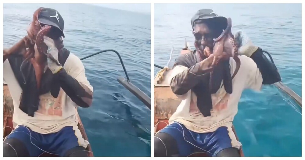 Рыбак столкнулся с неожиданным сопротивлением со стороны пойманного осьминога. Моллюск внезапно вцепился ему в лицо. Осьминог активно оборонялся, и мужчине не удалось мгновенно освободиться от захвата.