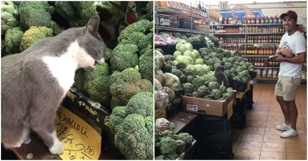 Посетитель магазина запечатлела кота, лакомившегося брокколи. Пушистый с большим удовольствием вгрызался в растение.