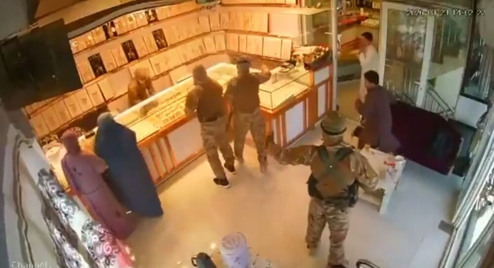 Камера наблюдения, установленная в ювелирном магазине в городе Андхой, запечатлела момент ограбления. Группа налетчиков в военной форме ворвалась в здание и начала складывать украшения в пакеты.