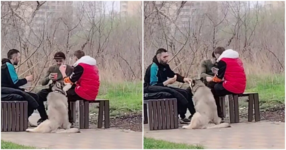 Домашний пёс Локи прибился к компании мужчин, которые выпивали на лавочках. Питомца заинтересовало мясо, которым закусывали незнакомцы.
