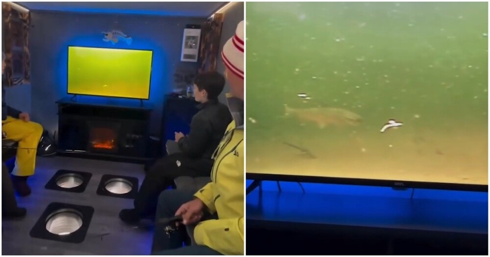 Мужчина заснял, в каких условиях они ловят рыбу. Рыбаки сидят в уютном трейлере с электрокамином и наблюдают за подводным миром через камеру.