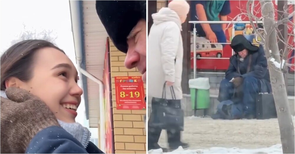 Старое, но трогательное видео, в котором девушка под Новый год решила сделать приятное пожилому мужчине, сидевшему на улице в холодную погоду.
