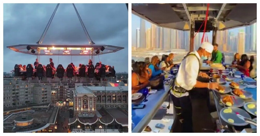 Ресторан, посещение которого запомнится надолго. Большой обеденный стол вместе с гостями и поварами поднимается на высоту с помощью крана.