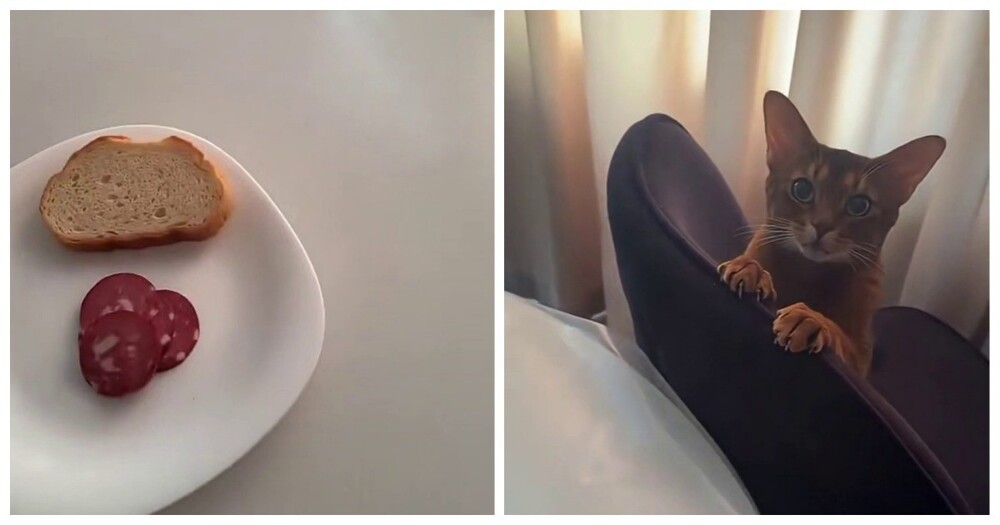 Абиссинской кошке захотелось колбасы со стола. Она начала уговаривать хозяина дать ей "запретный плод".