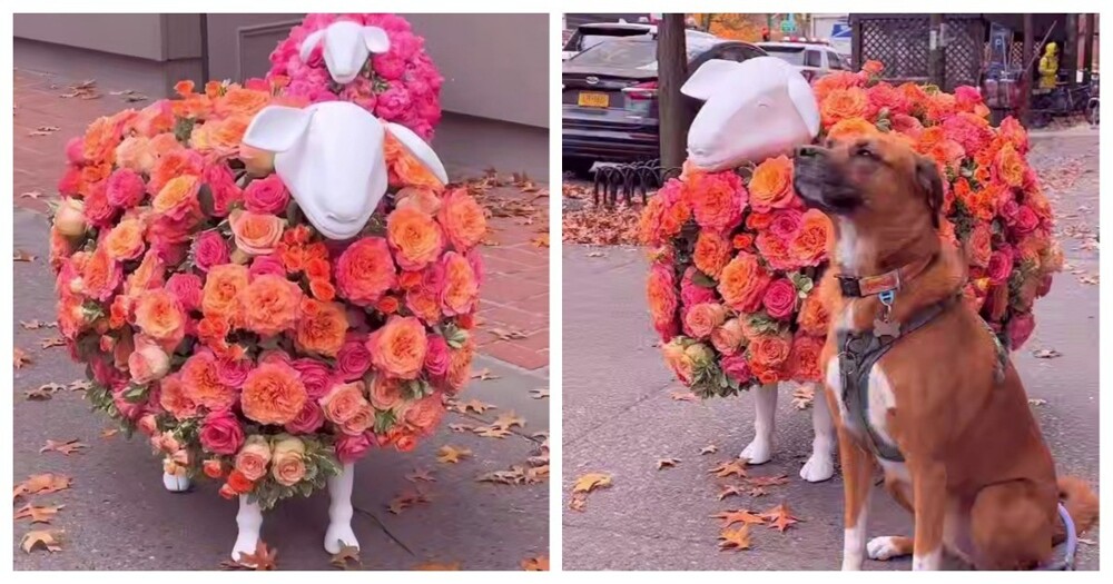 Цветочных овечек засняли возле одного из магазинов на Коламбус-авеню в Нью-Йорке. Овцы заинтересовали не только людей, но и животных.