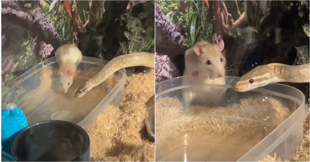 Девушка хотела накормить питона крысой, однако ситуация пошла неожиданным образом — животные не проявили агрессии и со временем стали спокойно сосуществовать. По словам хозяйки, позже они даже вместе пили из одной поилки. В итоге крыса осталась жить у неё и получила имя Снэк.