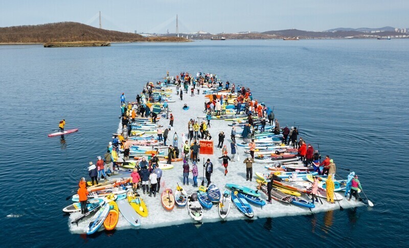 Во Владивостоке есть необычная весенняя традиция — угон огромной льдины. Участники на сапах находят подходящую льдину, добираются до неё, высаживаются и всей командой перегоняют в новое место, гребя по периметру.