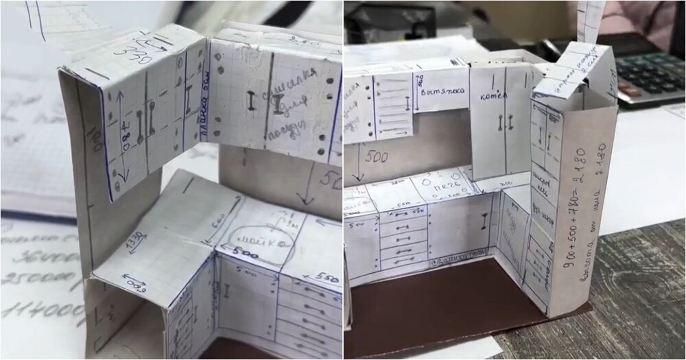 Оказалось, что вечером у девушки разболелась голова, и чтобы отвлечься, она решила занять себя делом. Всего за пару часов она вручную собрала из бумаги полноценный макет кухни — с размерами, разметкой и деталями.