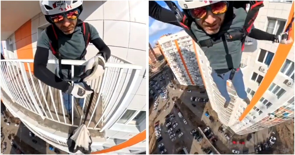 В Красноярске мужчина решился на опасный трюк. Он прыгнул с парашютом с балкона многоэтажного дома. Кадры полета с высоты минимум в 20 этажей экстремал снял на экшн-камеру.
